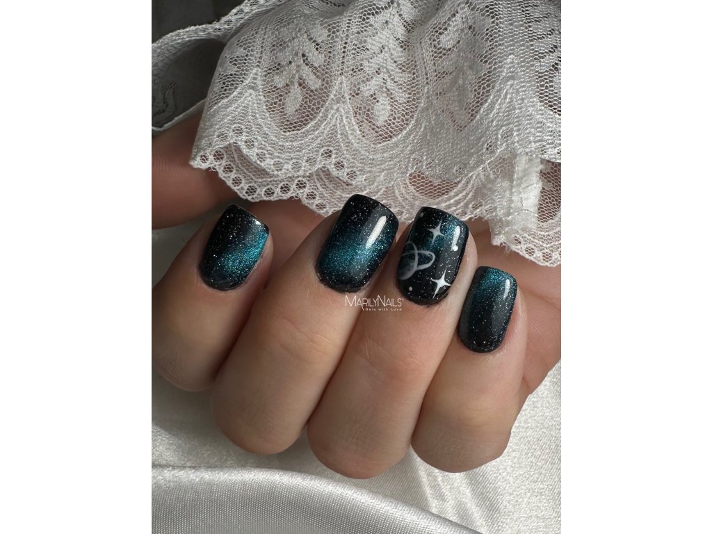 Způsob aplikace: na černý gel, nebo gel lak aplikujte jednu středně silnou vrstvu Cat Eye gel laku. Pomocí speciálního Cat Eye magnetu vytvarujte tvar glitrů podle svých představ. Okamžitě vytvrďte v LED lampě min. 60 sec. (v UV 120 sec.). Aplikujte vrchní lesk, nebo matt.